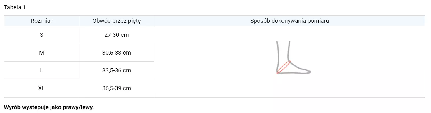 - Tabela 1 obwód przez piętę (sposób pomiaru wskazany na grafice poniżej)