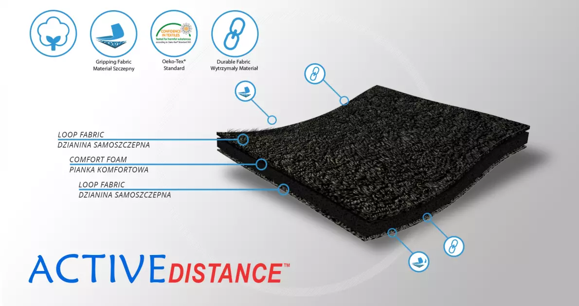 ActiveDistance™ to trójwarstwowy aktywny surowiec, który składa się z pianki komfortowej oraz dwóch bardzo mocnych nierozciągliwych okładzin poliamidowych. Specyfika surowca ActiveDistance™ polega na tym, że nie jest on elastyczny przez co polepsza stabilizację zabezpieczonej części ciała. Dzięki zastosowaniu w surowcu pianki komfortowej, jest on bardzo miękki, co poprawia komfort użytkowania wyrobów z niego wykonanych. Dodatkowym atutem surowca ActiveDistance™ jest fakt, że posiada on obustronną funkcję samoszczepną, co zdecydowanie ułatwia jego użytkowanie.