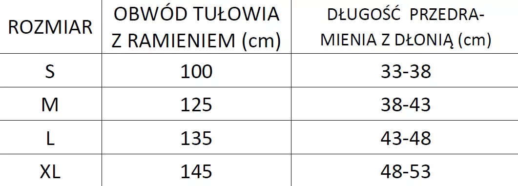 W celu dobrania odpowiedniego rozmiaru sugeruj się poniższą tabelą.